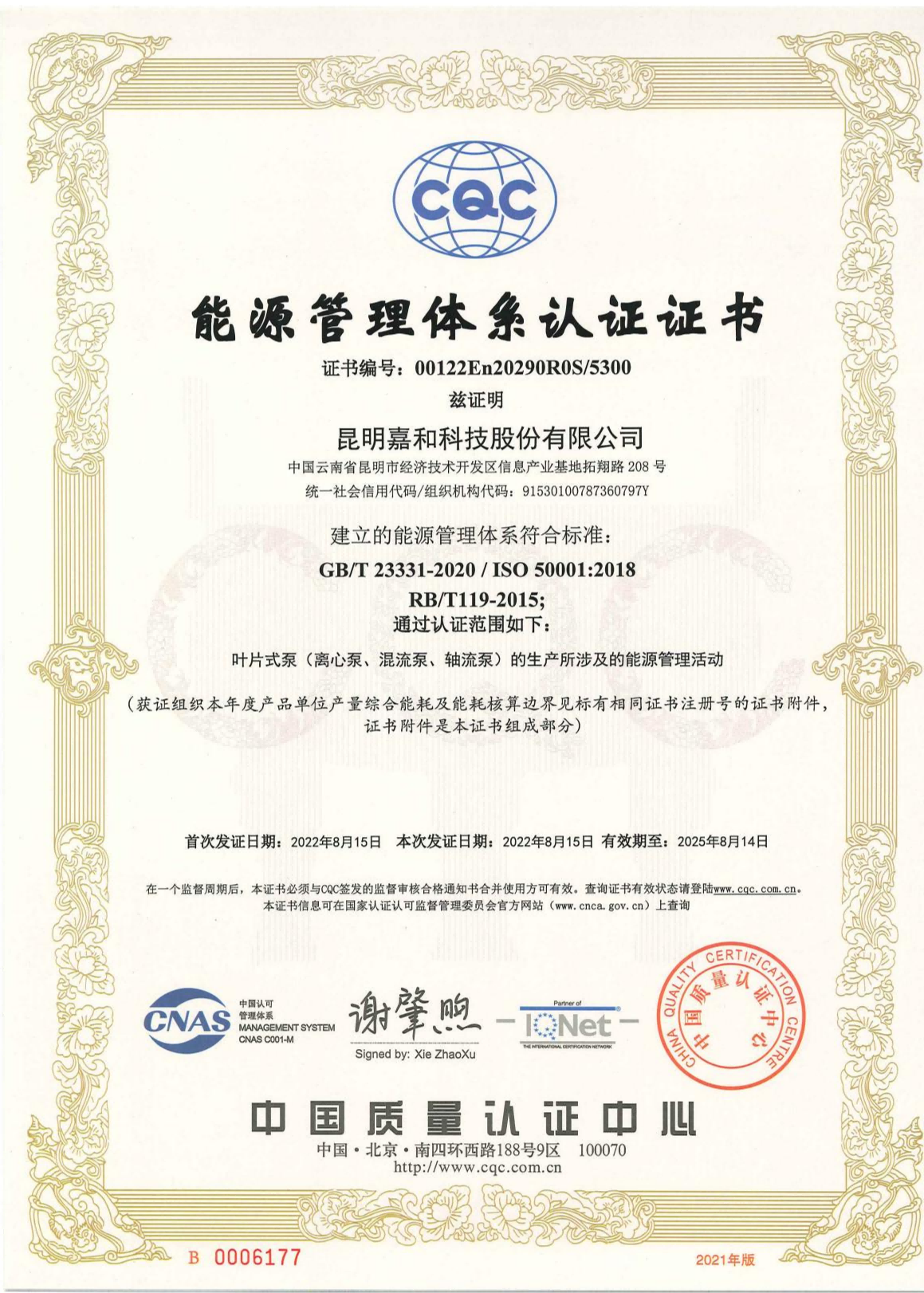 能源管理體系認證證書