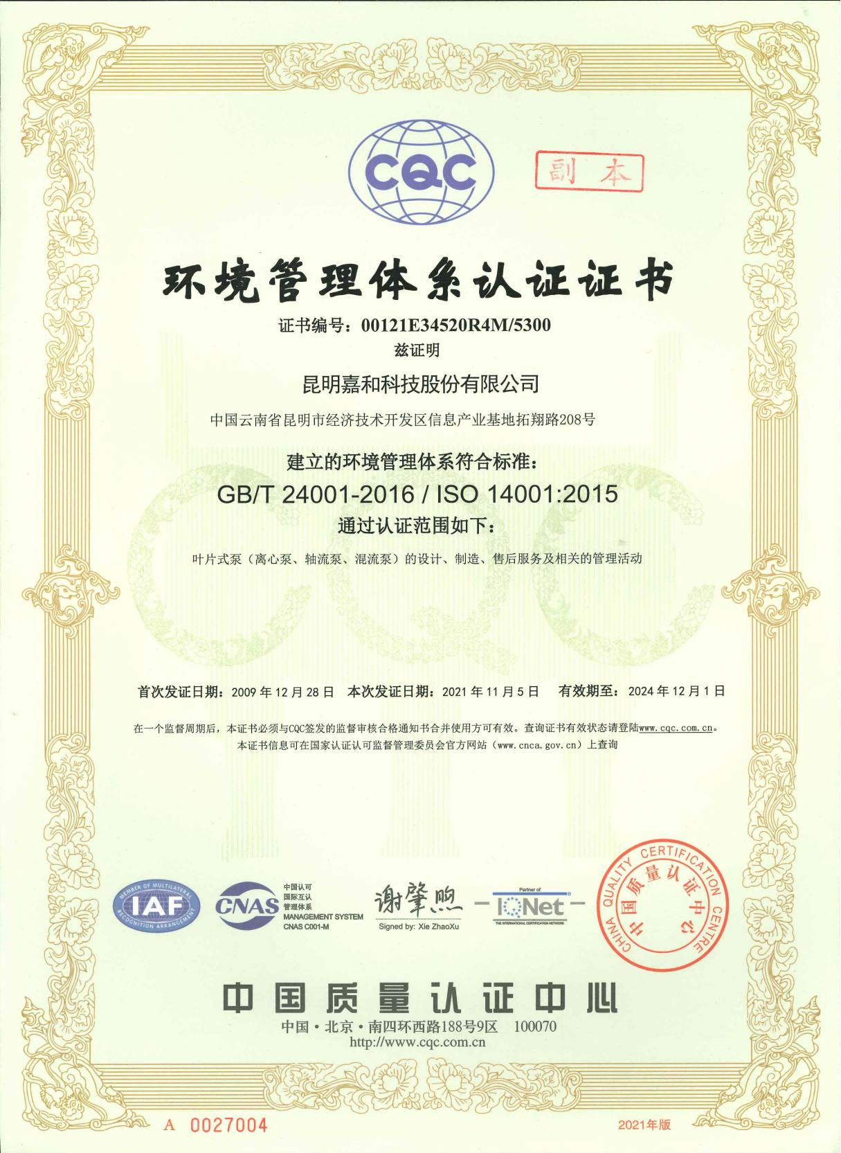環境管理體系認證證書