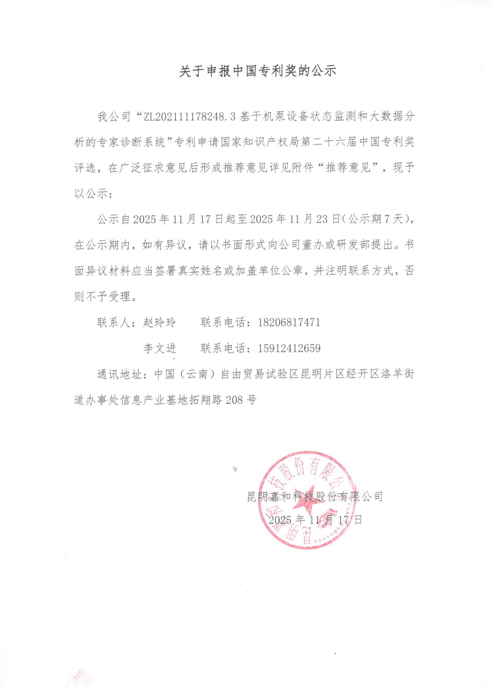 關于申報中國專利獎的公示